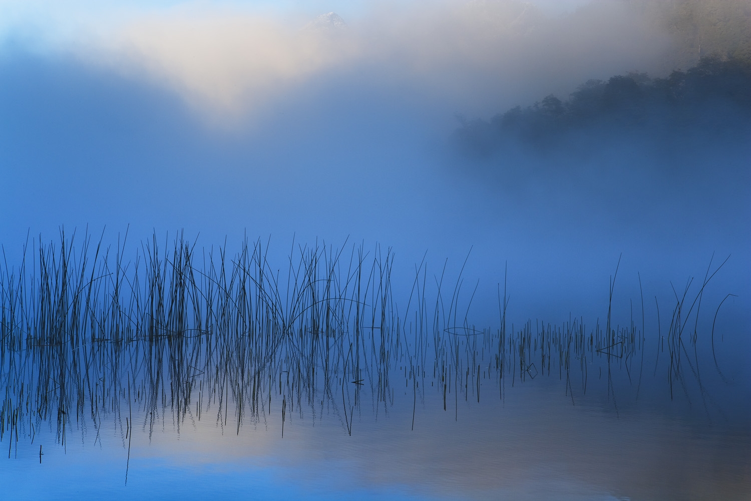 My wife and I had crossed the border from Chile into Argentina in northern Patagonia the evening before. We decided to set up camp near a small lake not too far from the border. When we woke up in the morning the lake was covered in thick fog. As the rising sun increased its power, the fog slowly burned off and opened up a glimpse of the lake and the high mountains behind it.
