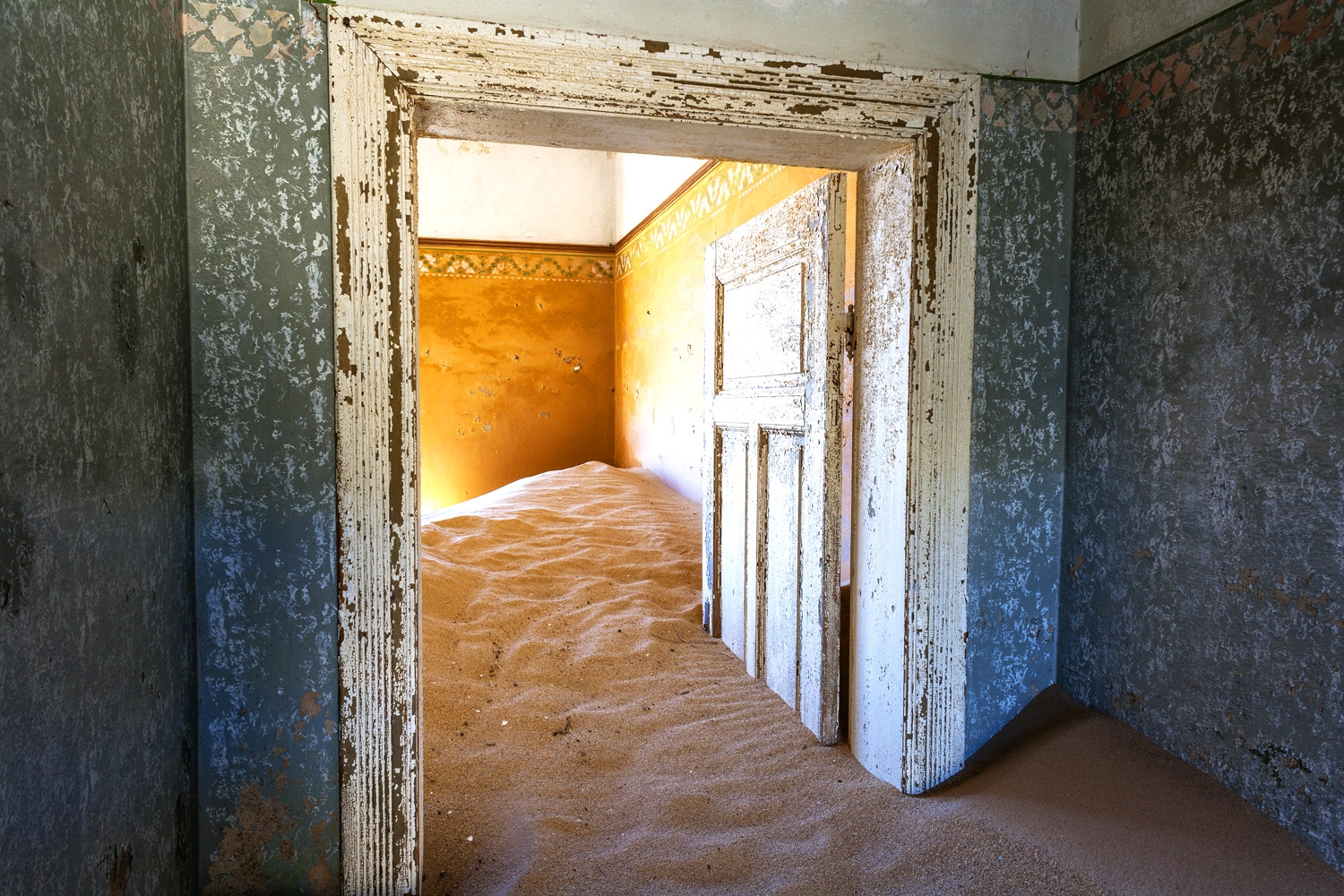 The town started to decline after World War II when the diamond-field slowly started to deplete. By the early 50s, the area was in decline and was ultimately abandoned in 1956. Since then the desert has started to reclaim the town. Sand has invaded most houses and filled up the interior of some rooms almost to the ceiling.